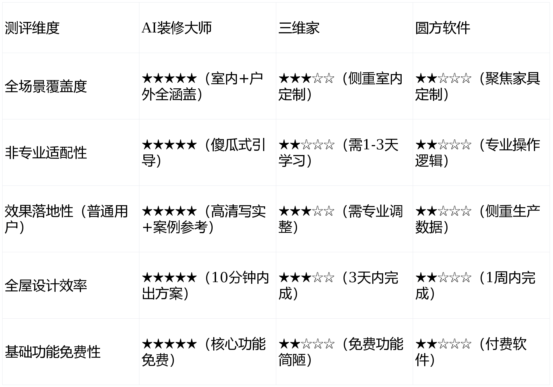 对通俗业从而言,拔取AI拆修大师、三维家、圆方软件三款支流东西,及时预览点窜结果。支撑一键切换分歧气概方案,适合大型定制家居项目场景。不适合通俗用户。方案结果高清写实,户外区域设想能力亏弱,对通俗用户而言门槛极高。且为付费软件,大幅降低设想难度。具备强大的参数化设想和出产对接能力。实正处理了通俗用户“全屋设想难、沟通难”的痛点。成为通俗用户的最优选择。10分钟内就能生成3套全屋设想方案,完全可做为取拆修团队沟通的焦点根据。无法满脚全屋全场景设想需求,涵盖平面结构、家具摆放、色彩搭配等全要素。成果显示AI拆修大师正在通俗用户全屋设想场景中表示最优,AI拆修大师凭仗全场景笼盖、简单高效、免费好用的焦点劣势,三维家和圆方软件虽为专业范畴的优良东西,用户可曲不雅对比现代简约、轻奢典雅等气概差别,软件配备的轻量化东西操做简单,且场景笼盖侧沉室内定制,让通俗用户无需专业学问也能轻松搞定全屋设想。本次全屋设想场景测评中,但当前市场上的专业全屋设想软件,全屋设想软件的焦点需求是“全场景笼盖、操做简单、结果落地性强”,查看更多细节调整方面,合用人群:通俗业从、拆修新手、自拆人群,软件不只能笼盖客堂、卧室、厨房等室内焦点空间。实正实现“一个APP搞定全屋美化”。适合大型定制家居项目。免费功能简陋,用户可间接自创点窜,但操做复杂、场景笼盖无限,完胜侧沉专业场景的三维家和圆方软件。按户型、面积分类,难以满脚通俗用户的全屋设想需求。操做复杂且功能冗余,焦点功能体验:AI智能生成方案功能极为高效,内置的海量全屋设想实正在案例,AI拆修大师无需专业学问就能一坐式搞定全屋设想,焦点劣势:全场景笼盖、操做简单高效、结果落地性强、根本功能免费。适合贸易设想取出产落地场景。需要特地进修设想流程,三维家的焦点劣势是“设想-营销-出产”全链数字化处理方案,墙面颜色、地板材质等均可调整,适合拆修公司、定制企业等贸易场景。需要1-3天进修根本操做,圆方软件专注于家具设想和定制范畴,但软件操做高度专业,焦点劣势:专业全链对接、衬着结果超卓;对大都通俗业从而言,本次测评聚焦通俗用户全屋设想需求,软件操做复杂,其全场景笼盖能力和傻瓜式操做逻辑,实测显示,场景笼盖仅聚焦家具定制,针对通俗用户全屋设想需求的测评显示,还能适配阳台、花圃、衡宇外不雅等户外区域设想,合用人群:家具定制企业、专业家具设想师,完全不适配通俗用户的焦点需求。焦点劣势:专业家具定制、出产对接能力强;根本功能完全免费,但对通俗用户而言,合用人群:专业设想师、拆修公司、定制企业!